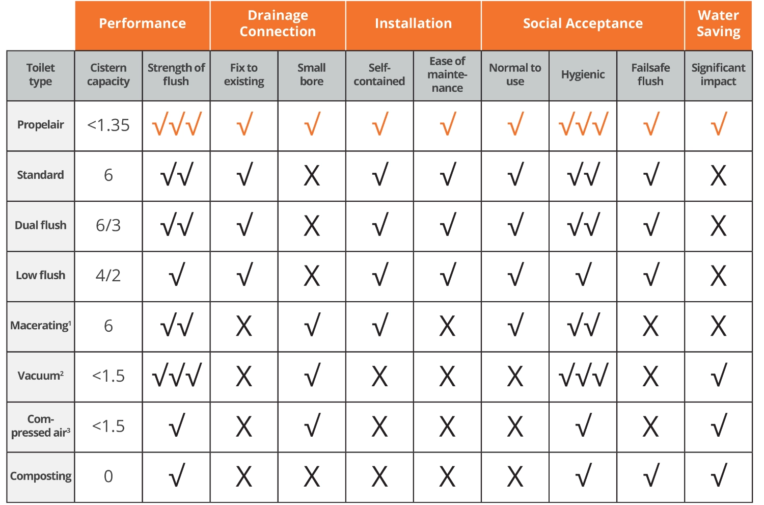 The lack of success in alternative sanitary systems together with inferior competitor claims truly sets the Propelair toilet apart from other market options. In many cases, traditional and innovative alternatives require double flushing to clear content, resulting in significantly higher water usage than their designed cistern capacity. Leakages from retrofitted alternatives also compromises the objective of saving water.